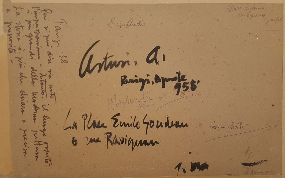 A tergo firma, luogo, data e titolo posti al centro: “Asturi A. Parigi, Aprile 958. La Place Emile Goudeau e Rue Ravignan”. Inoltre, sulla sinistra, in verticale, si legge la nota sempre di pugno dell’artista: “Parigi 58. Qui si può dire sia nato l’impressionismo. Intanto il luogo ospitò i più grandi della moderna pittura. La storia è più che chiara e precisa a proposito“.