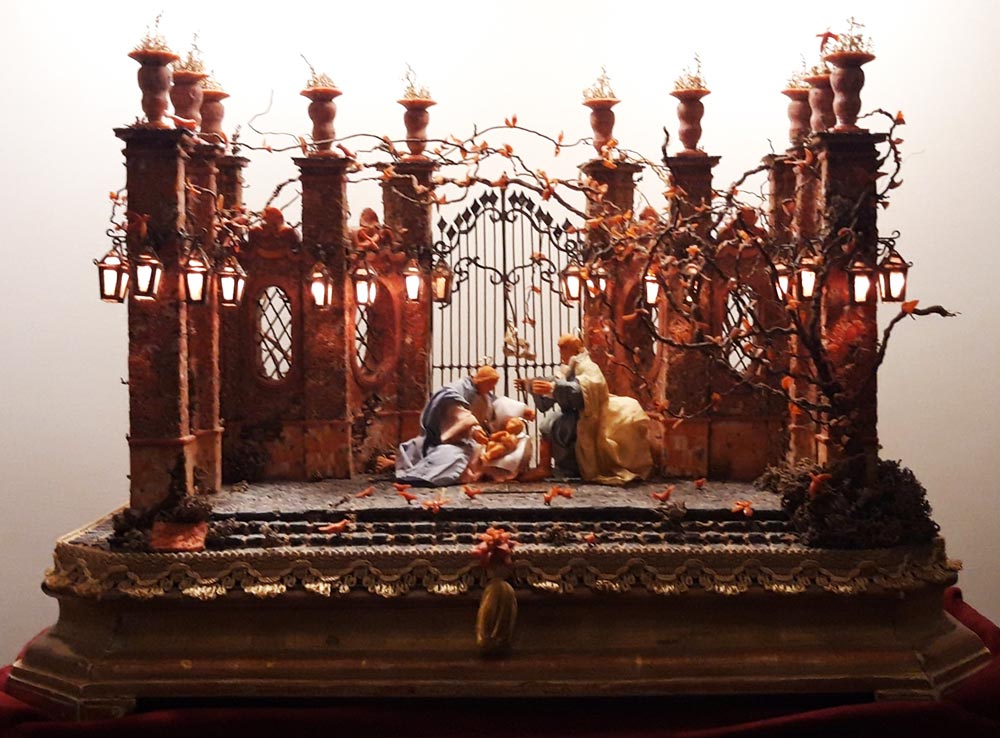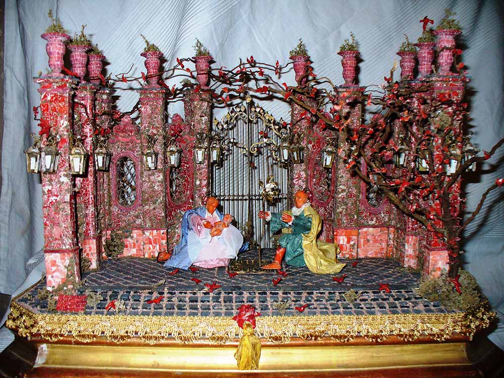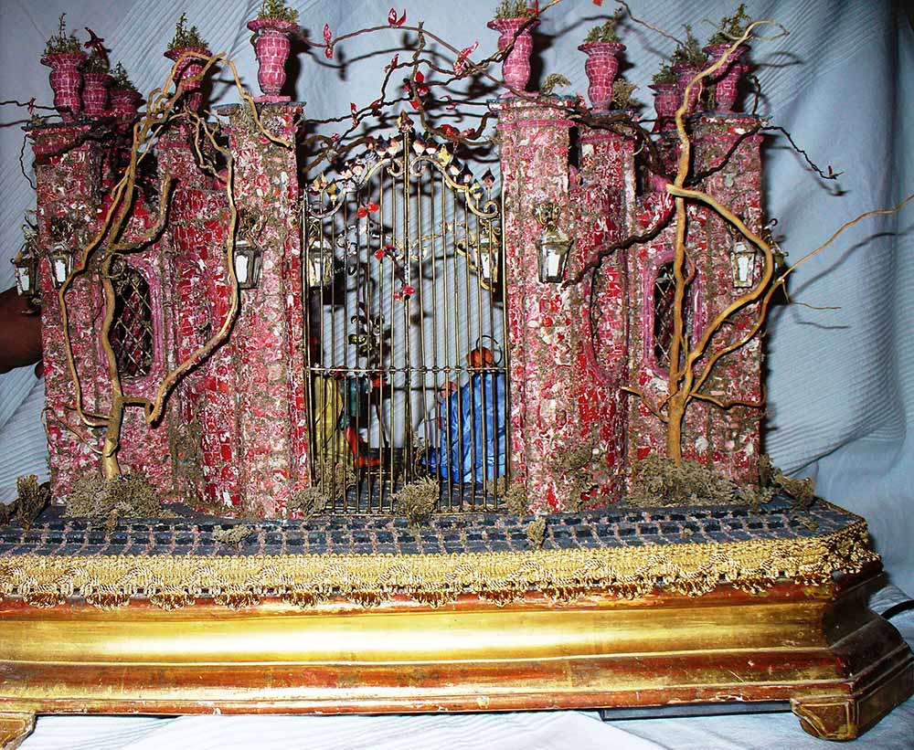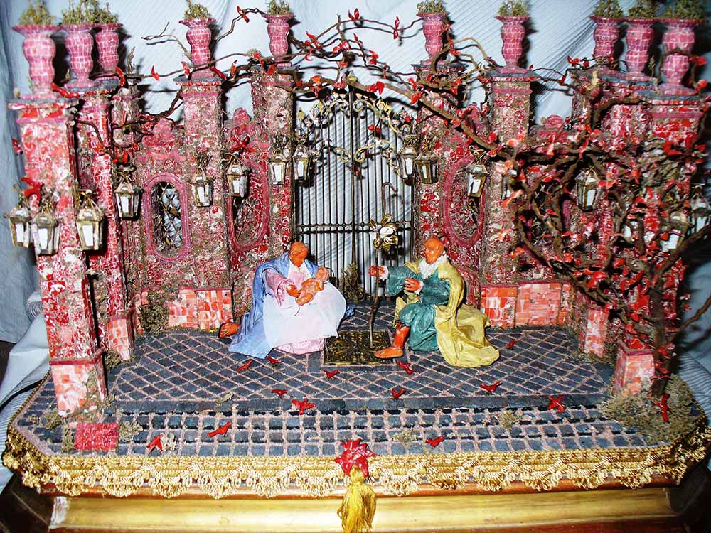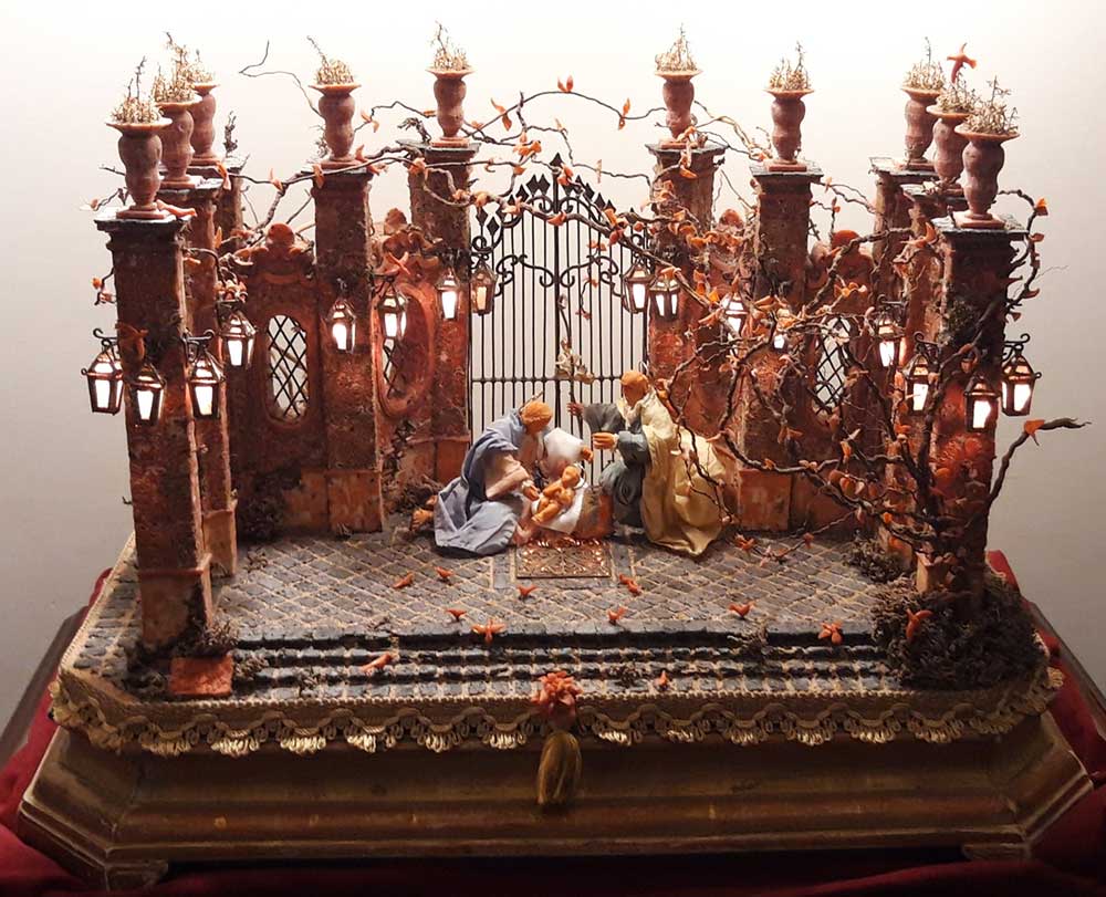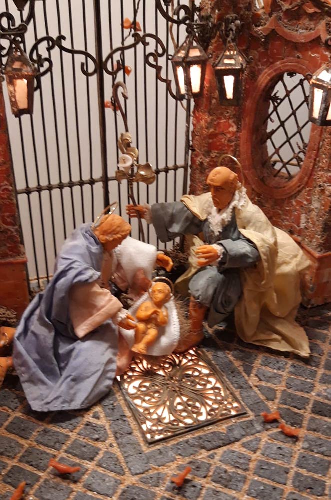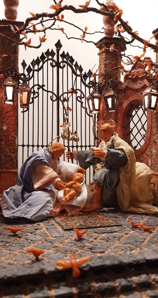 Per la realizzazione di questo spettacolare presepe, l’autore Antonio Marciano ha usato diversi tipi di pietre preziose: corallo rosso, corallo bianco, corallo rosato, oro, ottone, pietra lava del Vesuvio, il tutto arricchito da una antica base di legno di oro zecchino del XIX sec; i pastori, invece sono in corallo con i vestiti di antiche stoffe con accessori d’oro, rubini e tartaruga.