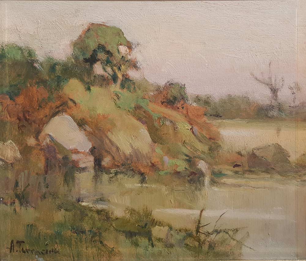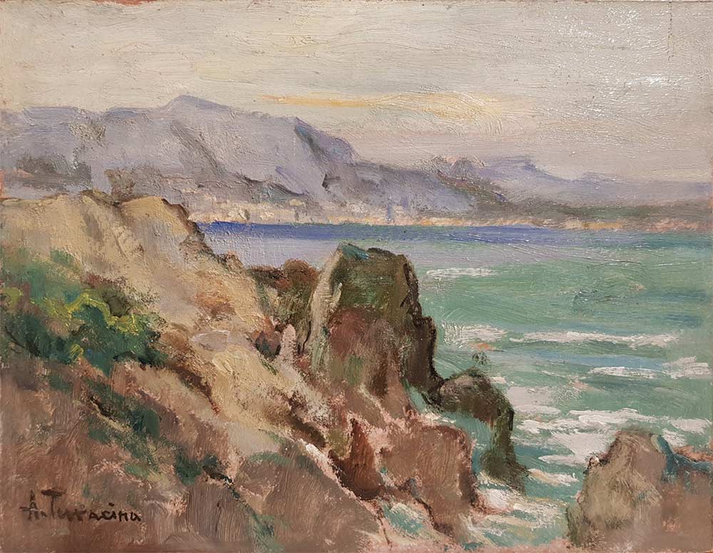 Arturo Bacio Terracina, nato a Napoli il 5 settembre 1882. Dagli studi classici, s’iscrisse all’Accademia di Belle Arti e si diplomò nel 1908, per poi trasferirsi a Roma, dove frequentò la Scuola Libera. Fu allievo prediletto di Michele Cammarano, che lo avviò allo studio del paesaggio, genere che non ha più abbandonato, quantunque avesse esordito con opere di figura, formatosi alla Scuola di Vincenzo Volpe.