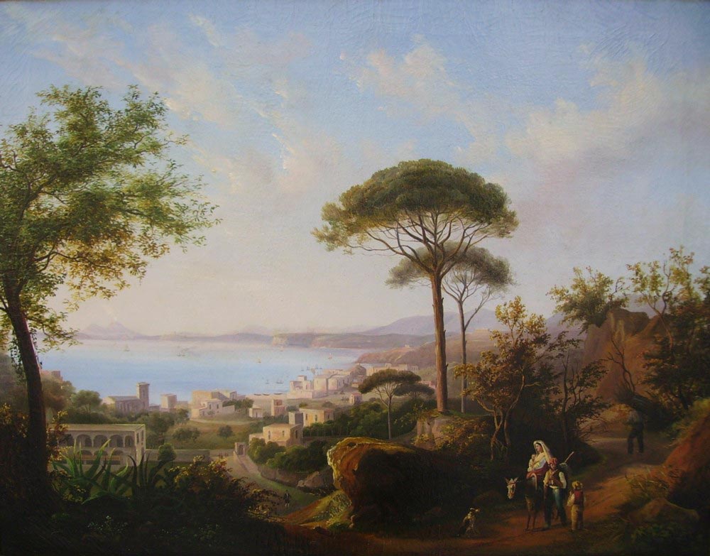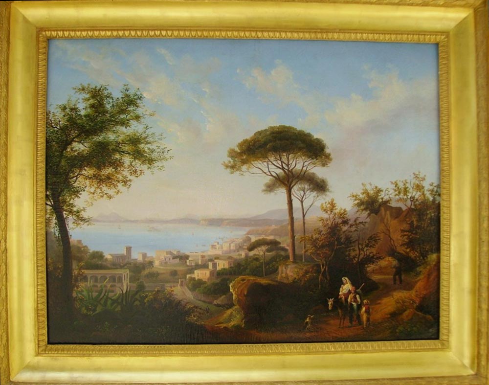 Affascinante è l’inquadratura del Golfo di Napoli visto dalla parte alta di Lacco Ameno di Ischia riconoscibile dal caratteristico scoglio a forma di “fungo” – e così chiamato – in mare nei pressi della costa sulla destra del dipinto, circondato da imbarcazioni. Altri elementi riconducibili al paesaggio ischitano sono la Villa Arbusto con le caratteristiche arcate in primo piano e la chiesa di Santa Restituta con il suo campanile sempre sulla sinistra del dipinto.