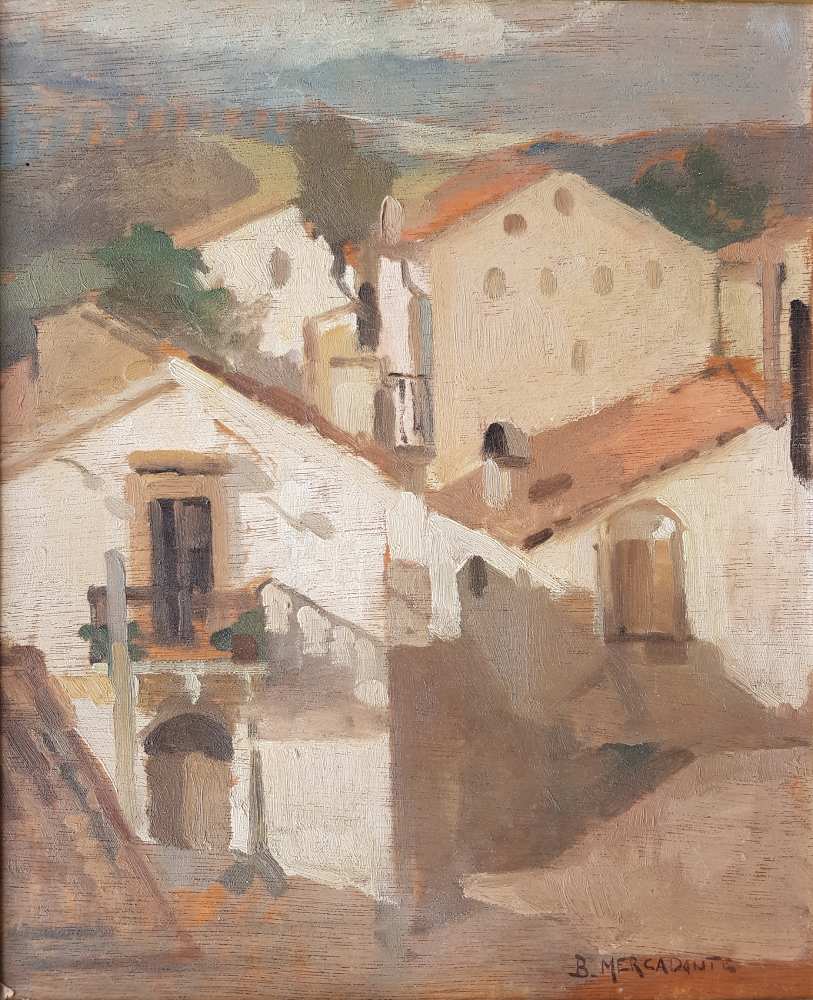 Nell’immediato dopoguerra riprendemmo a vederci allorché un comune e grande amico, amatore d’arte, bibliofilo e collezionista di raro intuito – Biagio D’Angelo – volle tentare la rinascita della Promotrice « Salvator Rosa », il cui archivio storico e le annate dei cataloghi delle esposizioni erano andati distrutti. In tale compito volle avere accanto Biagio Mercadante, come guida e collaboratore. La prima mostra della risorta Promotrice ebbe luogo in un locale di via dei Mille. Ma ogni anno bisognava trovare un nuovo locale: e questa ricorrente difficoltà, unita alla adesione imprevedibilmente scarsa di nuovi soci, finì con lo scoraggiare il buon Biagio D’Angelo, che cedette la presidenza della società all’avvocato Gaetano Vecchione. Anche Mercadante, deluso e amareggiato, se ne tornò a lavorare nella pace del suo studio di Sapri. Frattanto, nel 1953, invitato da Carlo Siviero, aveva partecipato alla « Mostra dell’Arte nella vita del Mezzogiorno d’Italia », presentando Paesaggio autunnale e Interno rustico, acquistati poi dallo Stato. L’ultimo incontro con Biagio Mercadante avvenne qualche anno fa, in occasione di una delle mostre d’arte contemporanea al Circolo Artistico Politecnico, ov’egli espose un’opera recente. La sua volontà e la sua tenacia avevano largamente agito sullo svolgimento della sua tendenza originaria e la sua pittura, di costituzione campana, rivelava come una seconda giovinezza, riflettendo quella dote rara, e al giorno d’oggi spregiata, che in etica si chiama « modestia » e in estetica « sincerità ».
