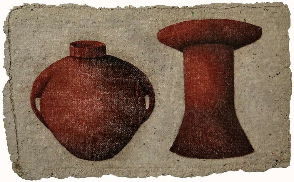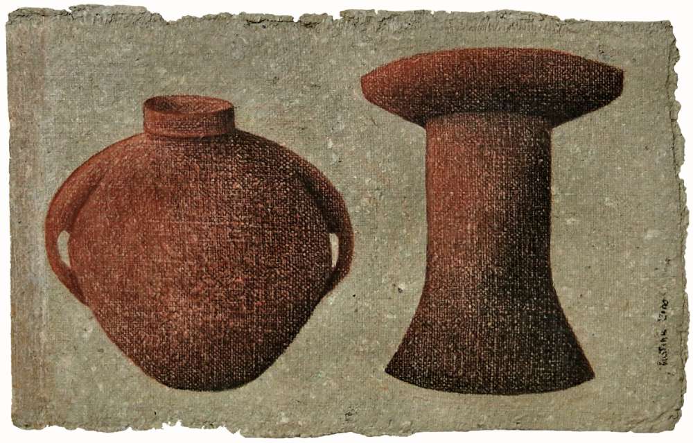 Foto del dipinto numero 2 del Trittico dell'artista Cristina Cianci, tecnica mista su cartapesta realizzata dall'autrice nel 2000, opera di 40x70 cm circa raffigurante due vasi contenitori