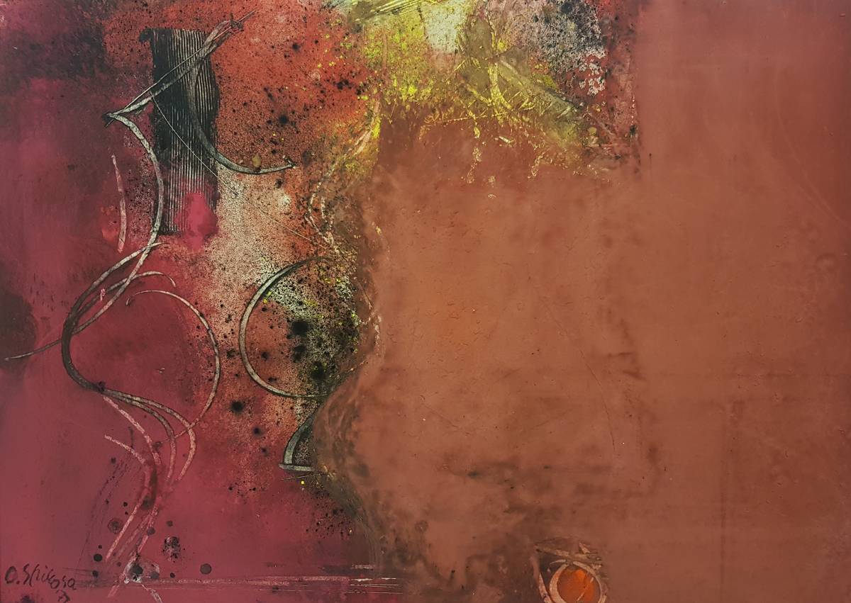 Affascinante opera di Domenico Spinosa, tecnica mista su carta, 50×70 cm, Rosso del 1972. L’artista costruisce la composizione attraverso un intenso gioco di tonalità calde, dove il rosso si espande come elemento dominante, accompagnato da sfumature di arancio, bruni e accenti luminosi di giallo. I segni grafici, tracciati con energia e spontaneità, si intrecciano alla materia pittorica creando dinamiche di movimento e profondità. La superficie alterna zone compatte e corpose a effetti di velatura, suggerendo vibrazioni interiori e tensioni emotive. Quest’opera, tipica della ricerca astratta di Spinosa, trasmette un forte impatto visivo ed emozionale, evocando la forza primordiale e vitale del colore.