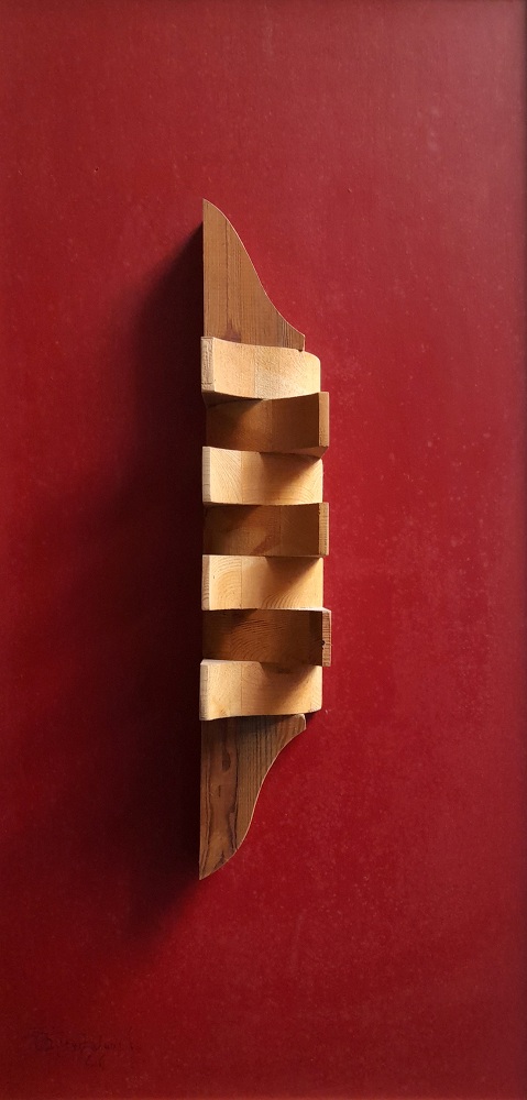 Opera dal forte impatto visivo, “Moduli” sintetizza la poetica di Eduardo Zanga, artista che ha saputo fondere rigore costruttivo e sensibilità materica. Su un fondo acrilico rosso intenso si innesta una struttura lignea verticale composta da elementi modulari che creano un raffinato ritmo di luci e ombre. Il contrasto tra la superficie pittorica liscia e la calda naturalità del legno genera una tensione armonica, dove colore e materia dialogano in equilibrio. L’opera riflette l’interesse di Zanga per la misura e la spazialità, intese come strumenti di meditazione visiva. L’artista esplora il confine tra pittura e scultura, trasformando il modulo in un segno plastico e spirituale. “Moduli” diventa così un luogo di silenzio e contemplazione, in cui ogni elemento trova la propria armonia in una sintesi astratta e rigorosa.