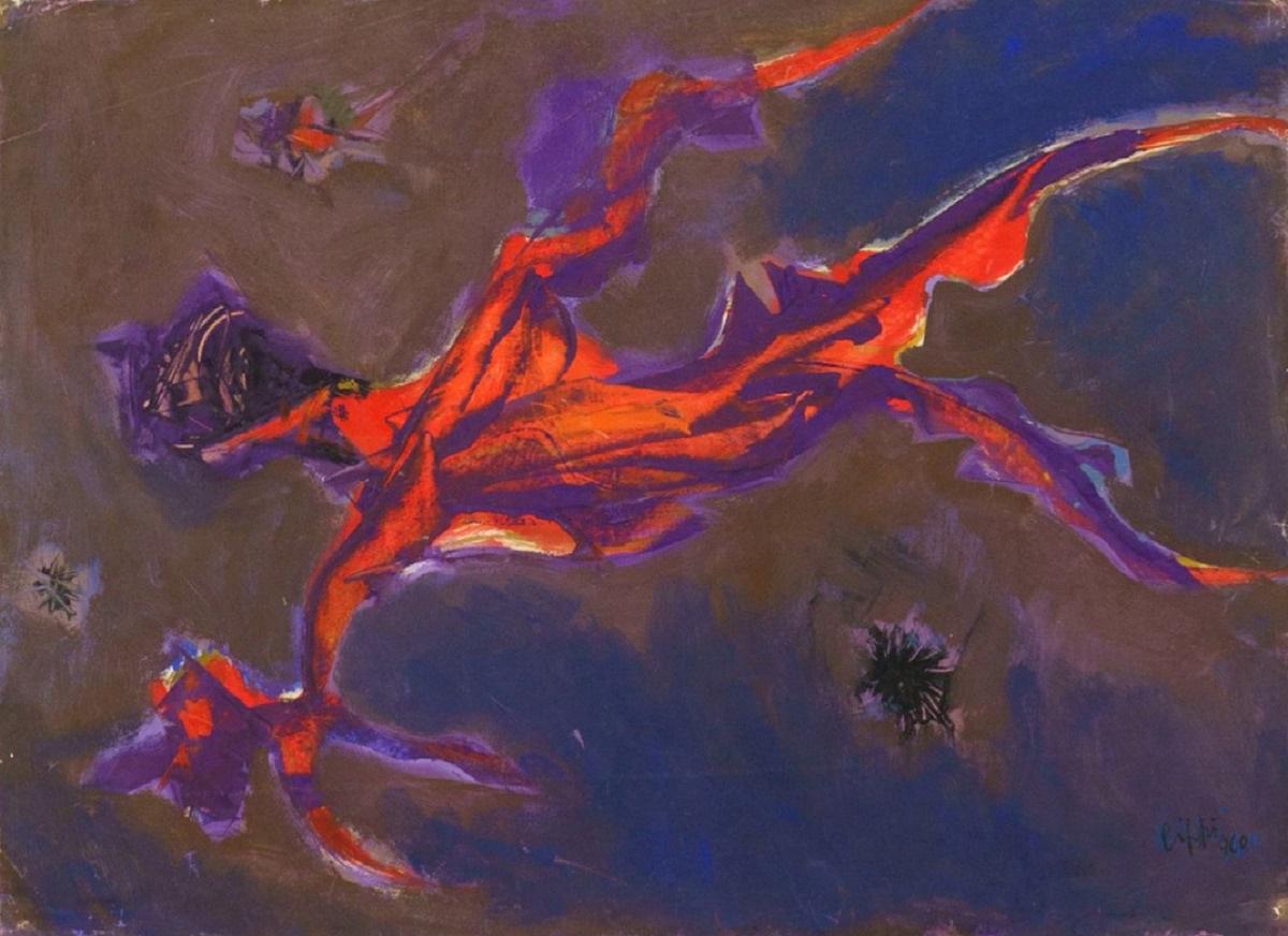 Il riferimento principale è a una piccola tela del 1959 intitolata Animali in cui l’artista rade al suolo ogni elemento prospettico e rinuncia ad ogni altro genere di preordinata indicazione spaziale, per inseguire la forma con un segno nervoso, per costringerla a snodarsi e a guizzare entro una pasta pittorica di denso ma fluido impasto. La divaricazione aperta da questo dipinto è enorme […].