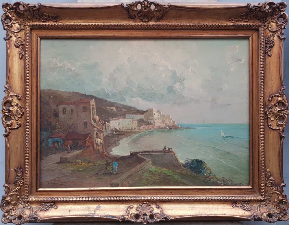 Foto del quadro incorniciato Marina di Amalfi del pittore Madonna Antonio (1919-2010), olio su masonite 50x70 cm
